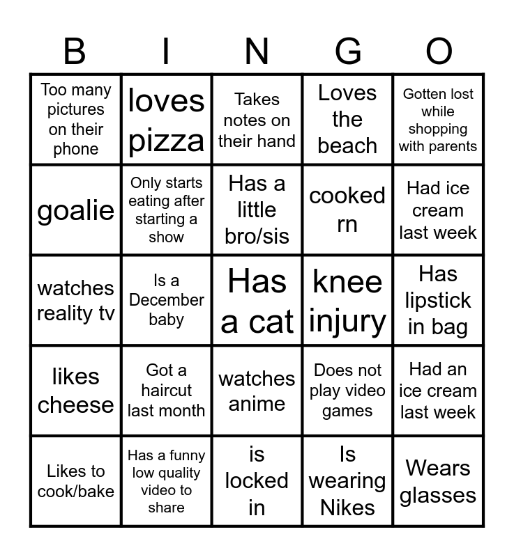 This bingo card has 29 words: Likes to cook/bake, Is an only child, Is a December baby, Wears glasses, Too many pictures on their phone, Takes notes on their hand, Only starts eating after starting a show, Got a haircut last month, knee injury, Has a funny low quality video to share, Has lipstick in bag, Has a cat, is locked in, Is wearing Nikes, Had ice cream last week, Has a dog, watches anime, likes cheese, Gotten lost while shopping with parents, watches reality tv, Does not play video games, Likes to sing, cooked rn, goalie, Loves the beach, loves pizza, Had an ice cream last week, Has a little bro/sis and Has lipstick in bag.
