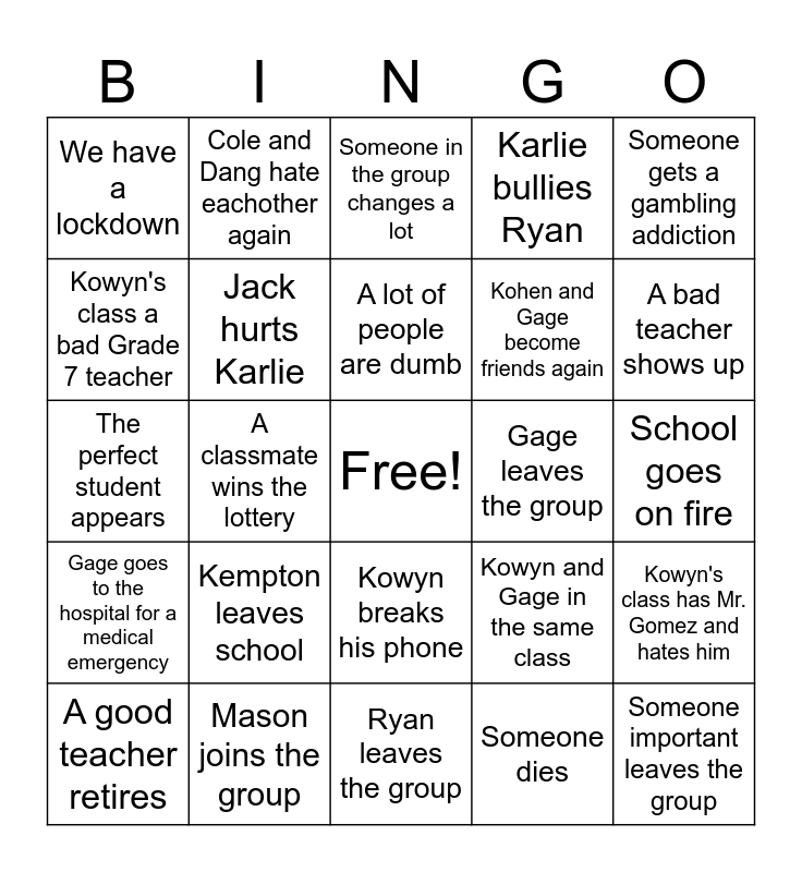 This bingo card has a free space and 49 words: Ryan has a crashout because of Karlie, Someone important leaves the group, New important members of the group, Ryan leaves the group, Kempton leaves school, Kowyn and Kohen stop being friends, Cole and Dang hate eachother again, Mason leaves the Mason Mafia, Kowyn's class a bad Grade 7 teacher, Cole's class has a good Grade 7 teacher, Jack hurts Karlie, Karlie bullies Ryan, Kowyn's class has Mr. Gomez and hates him, Kowyn and Gage in the same class, Gage and Sebby stop being friends, Cole leaves the group, A lot of people are dumb, Gage leaves the group, Kowyn gets a haircut, Someone gets a gambling addiction, A classmate wins the lottery, Someone dies, We have a lockdown, Kohen and Gage become friends again, Tech is the best class, A bad teacher shows up, A good teacher retires, Kohen gets a phone, Kowyn breaks his phone, Gage goes to the hospital for a medical emergency, One of the teachers goes on vacation, Gage quits roblox, Someone in the group gets a fatal sickness, New pandemic, Mason joins the group, Someone's parent becomes a teacher, Kohen gets cancer, Another giant heat wave, School goes on fire, The group falls apart, A rival group is formed, Art is the best class, Gym improves, The Mason mafia gets way worse, The perfect student appears, Someone in the group changes a lot, Someone in the group moves away, School Year ends early and The first day of school gets changed.