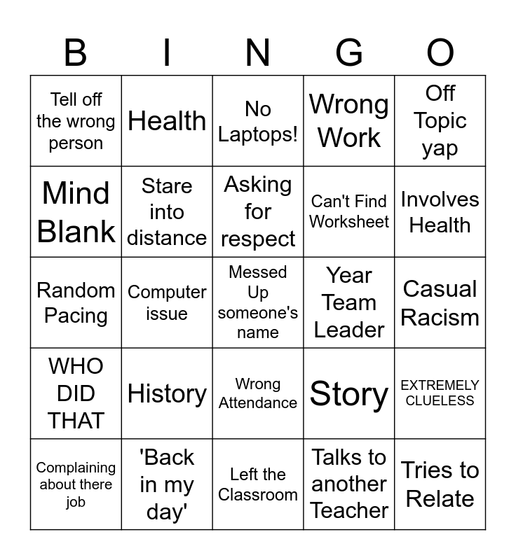 This bingo card has 30 words: 'Back in my day', Random Crash out, Computer issue, Family (children), Tell off the wrong person, No Laptops!, Stare into distance, Wrong Attendance, Year Team Leader, Left the Classroom, Casual Racism, Messed Up someone's name, Talks to another Teacher, Tries to Relate, Involves Health, Taught a teacher, Story, WHO DID THAT, History, Off Topic yap, Random Pacing, Phones, Health, Can't Find Worksheet, Mind Blank, Wrong Work, EXTREMELY CLUELESS, Complaining about there job, Asking for respect and Really Late.