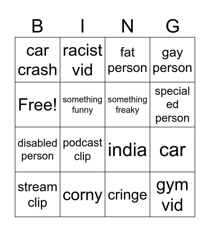 This bingo card has 16 words: corny, car, fat person, car crash, disabled person, racist vid, india, cringe, Free!, something funny, stream clip, gay person, podcast clip, special ed person, something freaky and gym vid.