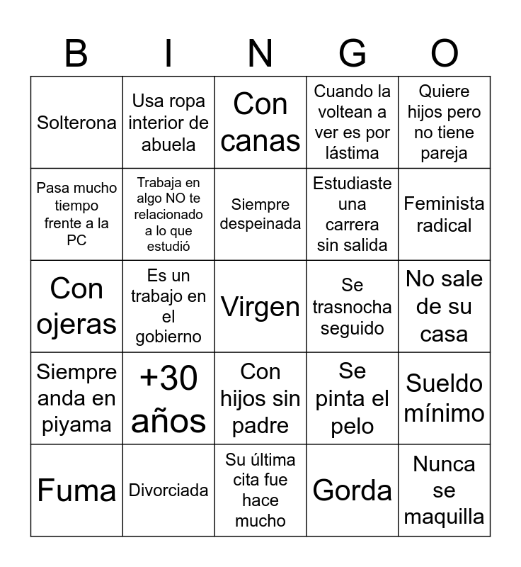 This bingo card has a free space and 24 words: +30 años, Divorciada, Siempre despeinada, Fuma, Quiere hijos pero no tiene pareja, Solterona, Pasa mucho tiempo frente a la PC, Usa ropa interior de abuela, Se trasnocha seguido, Con hijos sin padre, Estudiaste una carrera sin salida, Con ojeras, Se pinta el pelo, Sueldo mínimo, Trabaja en algo NO te relacionado a lo que estudió, Gorda, No sale de su casa, Con canas, Feminista radical, Es un trabajo en el gobierno, Nunca se maquilla, Siempre anda en piyama, Cuando la voltean a ver es por lástima and Su última cita fue hace mucho.
