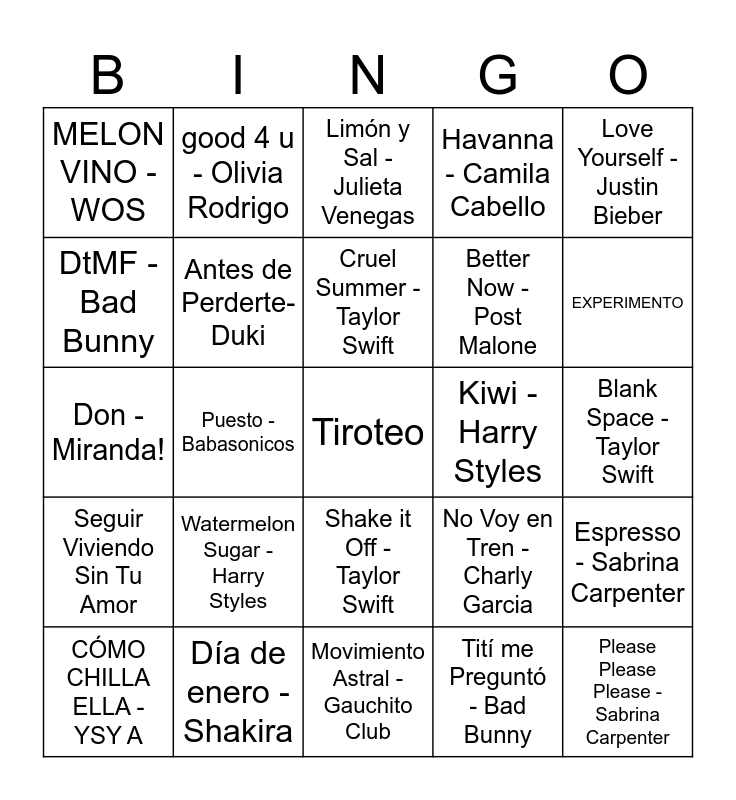 This bingo card has 45 words: EL ÚNICO, Tiroteo, 11 y 6 - Fito Paez, CÓMO CHILLA ELLA - YSY A, Consejo de Amor - TINI, Tití me Preguntó - Bad Bunny, Limón y Sal - Julieta Venegas, Parque Acuático - El Kuelgue, Love Yourself - Justin Bieber, Día de enero - Shakira, Havanna - Camila Cabello, Kiwi - Harry Styles, Shake it Off - Taylor Swift, Watermelon Sugar - Harry Styles, Side to Side - Ariana Grande, Movimiento Astral -Gauchito Club, De Música Ligera- Soda Stereo, Don - Miranda!, SOLEAO, EXPERIMENTO, good 4 u - Olivia Rodrigo, Crimen - Cerati, Loca - Tan Bionica, MELON VINO -WOS, Muñecas- TINI, Blank Space -Taylor Swift, Love Story- Taylor Swift, PELOTUDA - DILLOM, No Voy en Tren - Charly Garcia, Seguir Viviendo Sin Tu Amor, Carismático - Babasonicos, Espresso - Sabrina Carpenter, Persiana Americana - Soda Stereo, Un Poco de Amor Francés, Ahora Te Puedes Marchar, Puesto - Babasonicos, Fresa - Tini, Acaramelao - María Becerra, Please Please Please - Sabrina Carpenter, Cruel Summer - Taylor Swift, DtMF - Bad Bunny, Better Now - Post Malone, MEJOR QUE VOS - LALI, Antes de Perderte- Duki and Tu Misterioso Alguien - Miranda!.