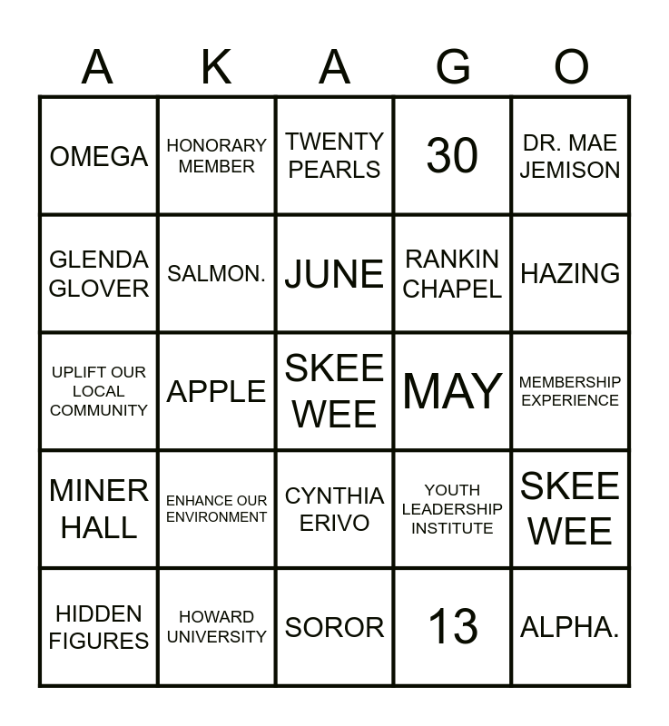 This bingo card has a free space and 60 words: ETHEL HEDGEMON LYLE, HOWARD UNIVERSITY, NELLIE QUANDER, MINER HALL, 13, 10, SALMON., MISSISSIPPI HEALTH PROJECT, RANKIN CHAPEL, EAF, 30, FAYE B. BRYANT, GLENDA GLOVER, PINKY, FMO, OMEGA, ALPHA., DR. MAE JEMISON, KAMALA HARRIS, JUNE, MAY, TWENTY PEARLS, HIDDEN FIGURES, SKEE WEE, ELEANOR ROOSEVELT, AKA PALS, BOULE, SISTERHOOD, HAZING, LIFE MEMBER, FOUNDERS’ DAY, GRADUATE MEMBER, GENERAL MEMBER, ASSOCIATE MEMBER, HONORARY MEMBER, IVY LEAF, PINK TEA ROSE, APPLE, ROBERT’S RULES OF ORDER, UPLIFT OUR LOCAL COMMUNITY, PROTOCOL, ENHANCE OUR ENVIRONMENT, MEMBERSHIP EXPERIENCE, INVITATION ONLY, YOUTH LEADERSHIP INSTITUTE, SERVICE, RISK MANAGEMENT, ADVOCATE FOR SOCIAL JUSTICE, STRENGTHEN OUR SISTERHOOD, CYNTHIA ERIVO, SOROR, IVY BEYOND THE WALL, SOUTH CENTRAL, SOUTH EASTERN, REACTIVATION, ALLYSON FELIX, DANETTE ANTHONY REED, BADGE, INCORPORATION and PINK GOES RED.