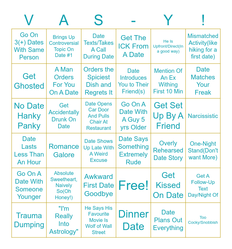 This bingo card has 36 words: Free!, Awkward First Date Goodbye, Dinner Date, Get Ghosted, Date Lasts Less Than An Hour, Go On A Date With A Guy 5 yrs Older, A Man Orders For You On A Date, He Says His Favourite Movie Is Wolf of Wall Street, He Is Upfront/Direct(In a good way), Get Kissed On Date, Date Matches Your Freak, Get The ICK From A Date, Get A Follow-Up Text Day/Night Of, Get Accidentally Drunk On Date, Date Introduces You to Their Friend(s), Go On 3(+) Dates With Same Person, Go On A Date With Someone Younger, Get Set Up By A Friend, No Date Hanky Panky, Date Texts/Takes A Call During Date, Date Opens Car Door And Pulls Chair At Restaurant, Romance Galore, Date Says Something Extremely Rude, Date Shows Up Late With A Weird Excuse, Overly Rehearsed Date Story, Brings Up Controversial Topic On Date #1, Mention Of An Ex Withing First 10 Min, "I'm Really Into Astrology", Orders the Spiciest Dish and Regrets It, Mismatched Activity(like hiking for a first date), Too Cocky/Snobbish, Trauma Dumping, One-Night Stand(Don't want More), Narcissistic, Absolute Sweetheart, Naively So(Oh Honey!) and Date Plans Out Everything.