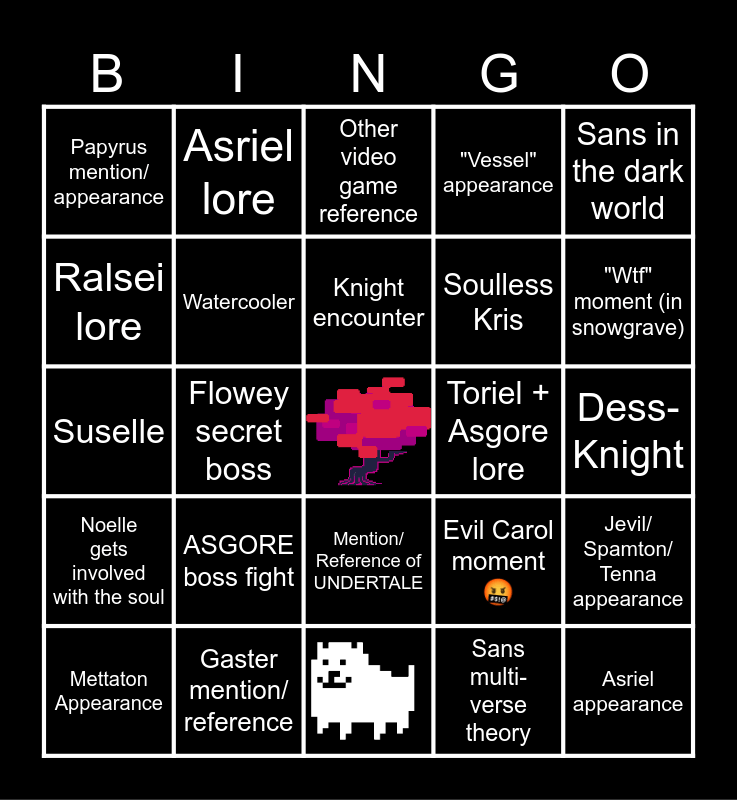 This bingo card has 1 images, a free space and 23 words: ASGORE boss fight, Gaster mention/ reference, Knight encounter, Mettaton Appearance, Sans in the dark world, Papyrus mention/ appearance, Ralsei lore, Asriel lore, Toriel + Asgore lore, Mention/ Reference of UNDERTALE, Soulless Kris, Suselle, Evil Carol moment 🤬, Jevil/ Spamton/ Tenna appearance, Watercooler, Sans multi-verse theory, Dess-Knight, Other video game reference, "Wtf" moment (in snowgrave), Flowey secret boss, Asriel appearance, Noelle gets involved with the soul and "Vessel" appearance.