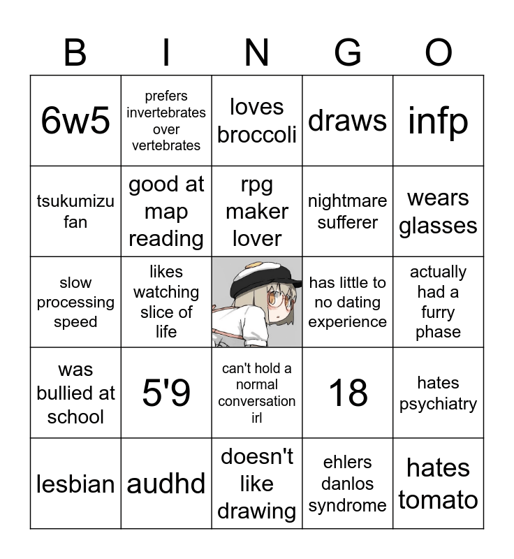 This bingo card has a free space and 24 words: 5'9, audhd, rpg maker lover, lesbian, infp, 6w5, tsukumizu fan, prefers invertebrates over vertebrates, has little to no dating experience, can't hold a normal conversation irl, nightmare sufferer, slow processing speed, 18, hates psychiatry, good at map reading, ehlers danlos syndrome, actually had a furry phase, loves broccoli, wears glasses, likes watching slice of life, hates tomato, was bullied at school, draws and doesn't like drawing.