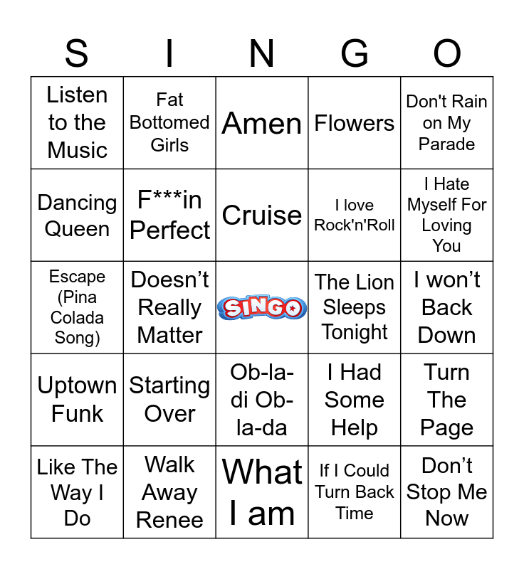 This bingo card has a free space and 75 words: 2 out of 3 Ain't Bad, A Matter of Trust, Amen, Ballroom Blitz, Beautiful Things, Black or White, Bohemian Rhapsody, Brown Eyed Girl, Build Me Up Buttercup, Casey Jones, Come and Get Your Love, Crazy Train, Cruise, Dancing Queen, Devil Went Down To Georgia, Doesn’t Really Matter, Dog Days Are Over, Don’t Stop Me Now, Don't Fear The Reeper, Don't Rain on My Parade, Down Incognito, Escape (Pina Colada Song), F***in Perfect, Fat Bottomed Girls, Flowers, Free Fallin', Funkytown, Hasn’t Hit Me Yet, Heart Shaped World, Here Comes The Sun, Hey Jude, Hey, Soul Sister, Hotel California, I Had Some Help, I Hate Myself For Loving You, I love Rock'n'Roll, I Touch Myself, I will Survive, I won’t Back Down, If I Could Turn Back Time, Jack & Diane, Joey, Johny B Goode., Just What I needed, Keep Your Hands to Yourself, Kokamo, Like The Way I Do, Listen to the Music, Mama Let Him Play, Millionaire, My Best Friend's Girl, Ob-la-di Ob-la-da, Old Time Rock'n'Roll, Personal Jesus, Picture, Return of the Mack, Rocket Man, Shallow, Something To Talk About, Son of a Preacher Man, Starting Over, Stop, Sweet Caroline, Sweet Home Alabama, The Joker, The Lion Sleeps Tonight, Thunderstruck, To Be With You, Truck Bed, Turn The Page, Uptown Funk, Walk Away Renee, Walkin' In Memphis, What I am and When I Come Around.