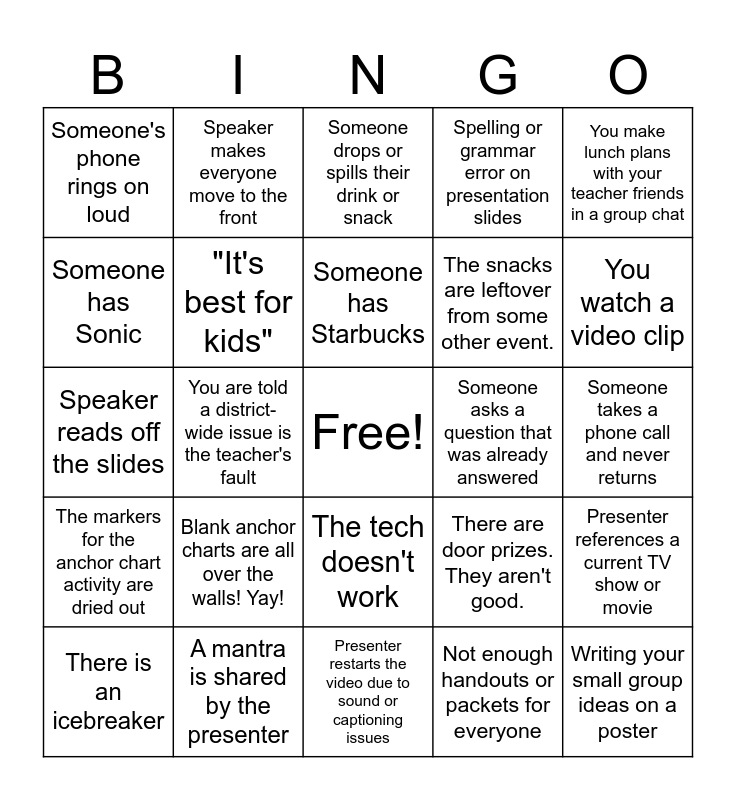 This bingo card has a free space and 45 words: Principal or admin is standing in the back of the room watching, Writing your small group ideas on a poster, Someone takes a picture of the slide (it's being emailed later), There is an icebreaker, "Let's break into small groups", Not enough handouts or packets for everyone, Someone drops or spills their drink or snack, You get the choice of a 5 minute break or getting out early, You make lunch plans with your teacher friends in a group chat, A mantra is shared by the presenter, Spelling or grammar error on presentation slides, Someone asks a question that was already answered, The tech doesn't work, Blank anchor charts are all over the walls! Yay!, Half-used sticky note pads on the table for some kind of activity, Presenter restarts the video due to sound or captioning issues, Presenter shares an "inspirational" story that isn't, Speaker reads off the slides, Someone takes a picture of the group, You watch a video clip, Speaker makes everyone move to the front, There are snacks, URL or QR code doesn't work, Someone's phone rings on loud, Someone is asleep, Someone takes a phone call and never returns, Someone mentions how hot the room is, Someone mentions how cold the room is, There are door prizes. They aren't good., The markers for the anchor chart activity are dried out, You have a guest speaker., Presenter references a current TV show or movie, An overexcited teacher engages way too much, Presenter uses buzzwords with no substance, You have to share a random fact about yourself, You are told a district-wide issue is the teacher's fault, Theatrical performance of behavior management strategies!, You are shown how to use a website/resource you've used for years, Presenter obviously never taught in a classroom before, Someone has Starbucks, Someone has Sonic, The snacks are leftover from some other event., There is candy on the table, "It's best for kids" and A teacher is online shopping.