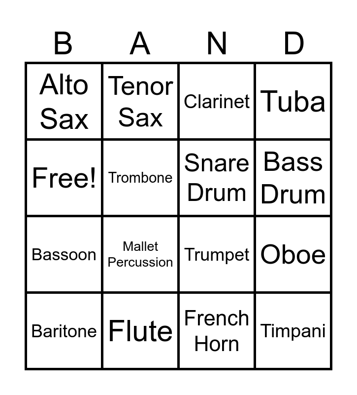 This bingo card has 16 words: Flute, Oboe, Clarinet, Alto Sax, Bassoon, Tenor Sax, Trumpet, French Horn, Free!, Trombone, Baritone, Tuba, Mallet Percussion, Bass Drum, Snare Drum and Timpani.