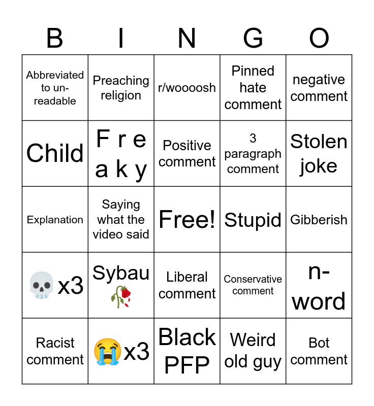 This bingo card has a free space and 24 words: Sybau🥀, ðŸ˜x3, Positive comment, Racist comment, negative comment, Abbreviated to un-readable, Child, Preaching religion, Stupid, Liberal comment, 3 paragraph comment, Explanation, Conservative comment, n-word, F r e a k y, Weird old guy, Gibberish, r/woooosh, Stolen joke, Saying what the video said, Bot comment, 💀x3, Pinned hate comment and Black PFP.
