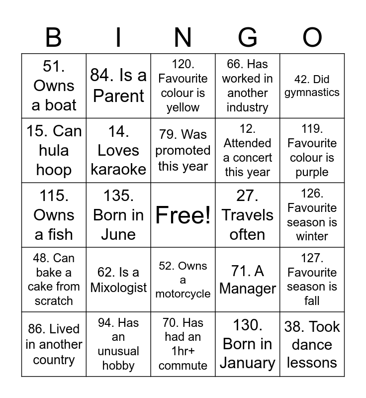 This bingo card has a free space and 151 words: 1. Met a celebrite 2. Knows sign language 3. Knows how to surf 4. Loves true crime podcasts 5. Likes pineapple on pizza 6. Been to Disneyland 7. Been to Disney world 8. Loves roller coasters 9. Does Yoga 10. Can do a cartwheel 11. Rides horse, 1. Met a celebrite, 2. Knows sign language, 3. Knows how to surf, 4. Loves true crime podcasts, 5. Likes pineapple on pizza, 6. Been to Disneyland, 7. Been to Disney world, 8. Loves roller coasters, 9. Does Yoga, 10. Can do a cartwheel, 11. Rides horses, 12. Attended a concert this year, 13. Screams during scary movies, 14. Loves karaoke, 15. Can hula hoop, 16. Has been skydiving, 17. Won at a casino, 18. Same birth month as you, 19. Owns same car brand as you, 20. Never learned to ride a bike, 21. Collects something, 22. Goes all-out on holiday decorating, 23. Has a phobia, 24. Has a BFF from high school, 25. Currently a student, 26. Listens to podcasts, 27. Travels often, 28. Has food allergies, 29. Named after a relative, 30. Has a scar, 31. Has broken a bone, 32. Has never broken a bone, 33. Has a nickname, 34. Birthday is on a holiday, 35. Has a bucket list, 36. Good cook, 37. Bad cook, 38. Took dance lessons, 39. Speaks 2+ languages, 40. Gardens, 41. Played basketball, 42. Did gymnastics, 43. Played football, 44. Played soccer, 45. Played badminton, 46. Likes to golf, 47. Traveled in the last year, 48. Can bake a cake from scratch, 49. Climbed a mountain, 50. Moved in the past year, 51. Owns a boat, 52. Owns a motorcycle, 53. Has a big backyard, 54. Can drive stick, 55. Reads newspapers, 56. Has been in a hot air balloon, 57. Has taken a cruise, 58. Ran in a marathon, 59. Watches documentaries, 60. Watches marvel movies, 61. Watches anime, 62. Is a Mixologist, 63. Has a snack stash, 64. Drinks 3+ cups coffee a day, 65. Has worked here 3+ years, 66. Has worked in another industry, 67. Has a favorite pen, 68. Has 0 unread emails, 69. Has worked here less then 1 year, 70. Has had an 1hr+ commute, 71. A Manager, 72. This is their first job, 73. Carpools, 74. Buys coffee every morning, 75. Buys lunch every day, 76. Works out before work, 77. Works out after work, 78. Going on vacation soon, 79. Was promoted this year, 80. Switched departments this year, 81. Only child, 82. Twin or triplet, 83. Comes from a big family, 84. Is a Parent, 85. Is a Grandparent, 86. Lived in another country, 87. Plays an instrument, 88. Read 10+ books this year, 89. Wears contacts, 90. Has a cat, 91. Has a dog, 92. Has an exotic pet, 93. Runs regularly, 94. Has an unusual hobby, 95. Lives with a roommate, 96. Has a tattoo, 97. Is left-handed, 98. Has been scuba diving, 99. Is double-jointed, 100. Vegetarian, 101. Introvert, 102. Extrovert, 103. Creates art, 104. Met partner through online dating, 105. Got engaged this year, 106. Bought a house this year, 107. Bought a car this year, 108. Has a sweet tooth, 109. Has a hidden talent, 110. Grew up in this city, 111. Has never been on an airplane, 112. Has never left the country, 113. Has been to Europe, 114. Has been to the USA, 115. Owns a fish, 116. Favourite colour is red, 117. Favourite colour is blue, 118. Favourite colour is green, 119. Favourite colour is purple, 120. Favourite colour is yellow, 121. Favourite colour is orange, 122. Loves shoes, 123. Loves clothes, 124. Someone who likes to read, 125. Someone who hates reading, 126. Favourite season is winter, 127. Favourite season is fall, 128. Favourite season is summer, 129. Favourite season is spring, 130. Born in January, 131. Born in February, 132. Born in march, 133. Born in April, 134. Born in may, 135. Born in June, 136. Born in July, 137. Born in august, 138. Born in September, 139. Born in October, 140. Born in November, 141. Born in December, 142. Has a sister, 143. Has a brother, 144. Is married, 145. Is single, 146. Can on speak one language, 147. Like sour candy, 148. Like to be outside, 149. Hates to be outside and 150. Doesn’t have their license.
