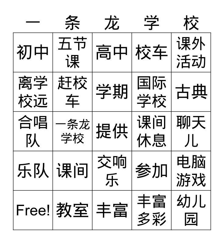This bingo card has 29 words: Free!, 介绍, 一条龙学校, 幼儿园, 初中, 高中, 赶校车, 课间, 课间休息, 教室, 聊天儿, 提供, 丰富, 丰富多彩, 古典, 流行, 交响乐, 乐队, 课外活动, 合唱队, 参加, 一所学校, 国际学校, 离学校远, 校车, 五节课, 电脑游戏, 学期 and 学年.