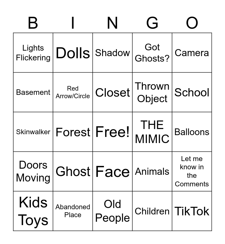 This bingo card has a free space and 24 words: Ghost, Abandoned Place, Closet, Kids Toys, Camera, Lights Flickering, Basement, Dolls, THE MIMIC, Face, Thrown Object, Skinwalker, Animals, Let me know in the Comments, Red Arrow/Circle, Children, Balloons, Shadow, School, Forest, TikTok, Doors Moving, Got Ghosts? and Old People.