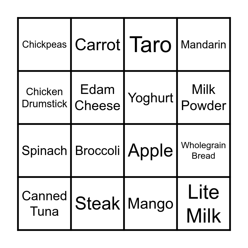 This bingo card has 20 words: Wholegrain Bread, Brown Rice, Taro, Green Banana, Canned Tuna, Chicken Drumstick, Steak, Chickpeas, Spinach, Carrot, Broccoli, Apple, Edam Cheese, Lite Milk, Yoghurt, Fortified Oat Milk, Milk Powder, Mandarin, Mango and Pork Loin.