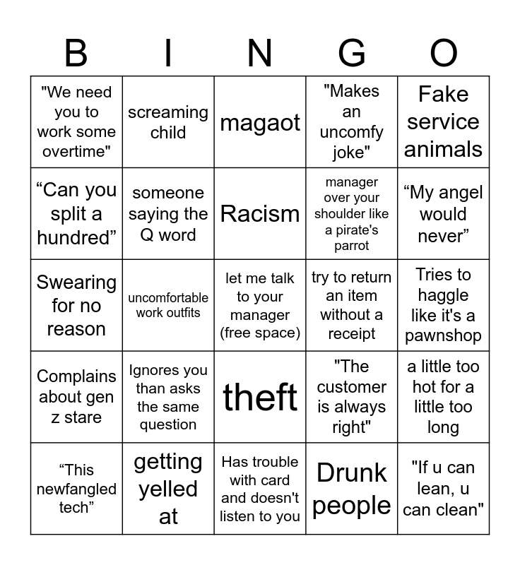 This bingo card has a free space and 34 words: sexism, Drunk people, “Back in my day”, Doesn't believe you know what you're talking about, Complains about gen z stare, someone saying the Q word, Fake service animals, “This newfangled tech”, screaming child, "I could do your job", Racism, magaot, someone walks in 2 minutes from closing, Crashing out over rewards program, try to return an item without a receipt, “My angel would never”, getting yelled at, Swearing for no reason, Ignores you than asks the same question, "The customer is always right", theft, Outdated coupons, "We need you to work some overtime", Tries to haggle like it's a pawnshop, Has trouble with card and doesn't listen to you, "If u can lean, u can clean", "Makes an uncomfy joke", teach issues, manager over your shoulder like a pirate's parrot, “Can you split a hundred”, "Do I have to tip", uncomfortable work outfits, a little too hot for a little too long and a little too cold for a little too long.
