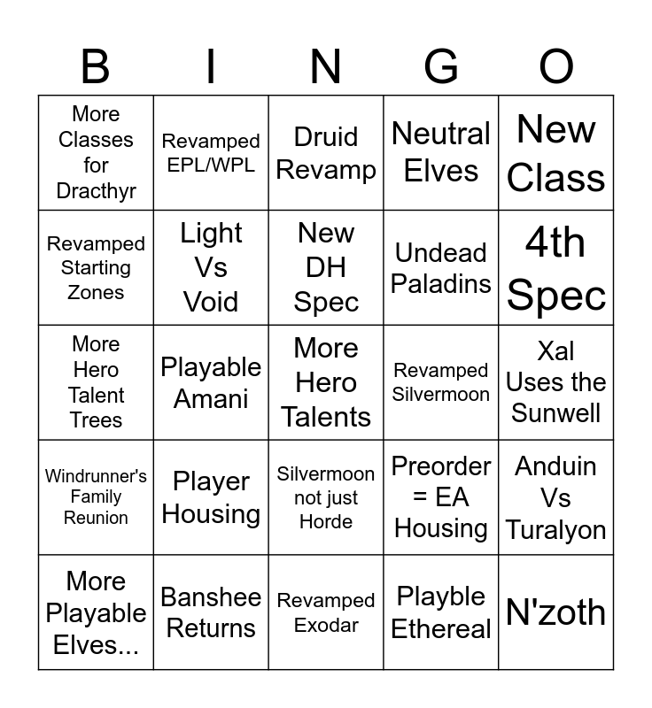 This bingo card has a free space and 24 words: Player Housing, Banshee Returns, New DH Spec, More Playable Elves..., New Class, More Classes for Dracthyr, Revamped Starting Zones, Revamped EPL/WPL, Revamped Silvermoon, Silvermoon not just Horde, Undead Paladins, More Hero Talent Trees, Preorder = EA Housing, Anduin Vs Turalyon, Light Vs Void, Playble Ethereal, Xal Uses the Sunwell, Druid Revamp, 4th Spec, Playable Amani, N'zoth, Windrunner's Family Reunion, Neutral Elves and Revamped Exodar.