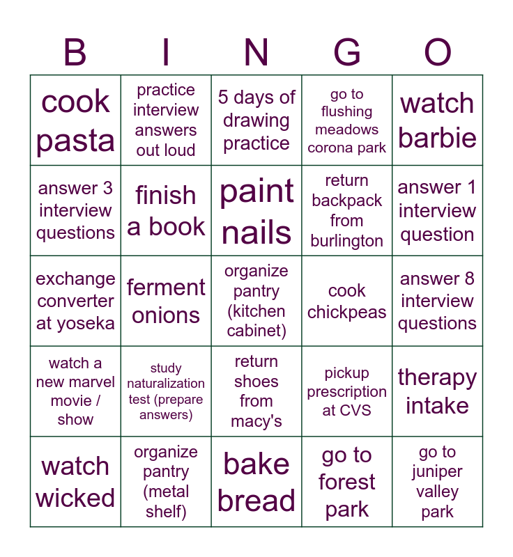 This bingo card has 25 words: study naturalization test (prepare answers), bake bread, paint nails, watch wicked, watch barbie, cook pasta, answer 3 interview questions, practice interview answers out loud, cook chickpeas, return shoes from macy's, return backpack from burlington, exchange converter at yoseka, pickup prescription at CVS, therapy intake, finish a book, go to juniper valley park, answer 8 interview questions, 5 days of drawing practice, answer 1 interview question, ferment onions, organize pantry (kitchen cabinet), organize pantry (metal shelf), watch a new marvel movie / show, go to flushing meadows corona park and go to forest park.