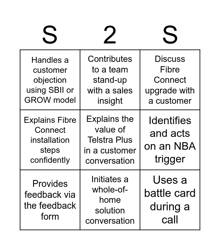 This bingo card has a free space and 8 words: Identifies and acts on an NBA trigger, Discuss Fibre Connect upgrade with a customer, Contributes to a team stand-up with a sales insight, Provides feedback via the feedback form, Handles a customer objection using SBII or GROW model, Uses a battle card during a call, Explains Fibre Connect installation steps confidently and Initiates a whole-of-home solution conversation.