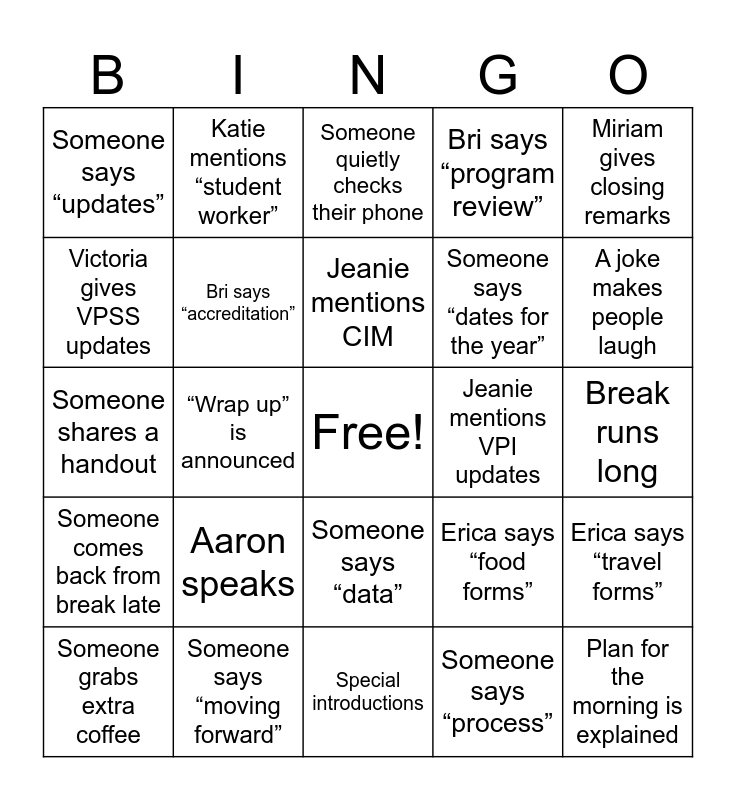 This bingo card has a free space and 51 words: Call to order, Plan for the morning is explained, President’s welcome, Special introductions, Aaron speaks, Erica speaks, Katie mentions “student worker”, Katie mentions “temporary / part-time”, Victoria gives VPSS updates, Jeanie says “census process”, Bri says “accreditation”, Bri says “program review”, Erica says “travel forms”, Erica says “food forms”, Erica mentions “business services”, Jeanie mentions SAAM, Jeanie mentions CIM, Jeanie mentions VPI updates, Miriam gives ILAT dates, Miriam gives closing remarks, “Wrap up” is announced, Someone says “process”, Someone says “updates”, Someone says “dates for the year”, Someone asks a clarifying question, Someone says “Can you repeat that?”, A joke makes people laugh, Someone leaves to take a call, Someone grabs extra coffee, Someone quietly checks their phone, Someone mentions “forms”, Someone says “policy”, Someone talks about “deadlines”, A presenter uses acronyms, Someone refers to last year’s process, Someone says “moving forward”, Someone shares a personal story, Someone says “good question”, People clap, Break is announced, Break runs long, Someone comes back from break late, Someone talks about budget, Someone says “resources”, Someone says “email me”, Someone asks for volunteers, Someone shares a handout, Someone says “we’ll follow up”, Someone mentions “student success”, Someone says “data” and Someone mentions “forms are changing”.