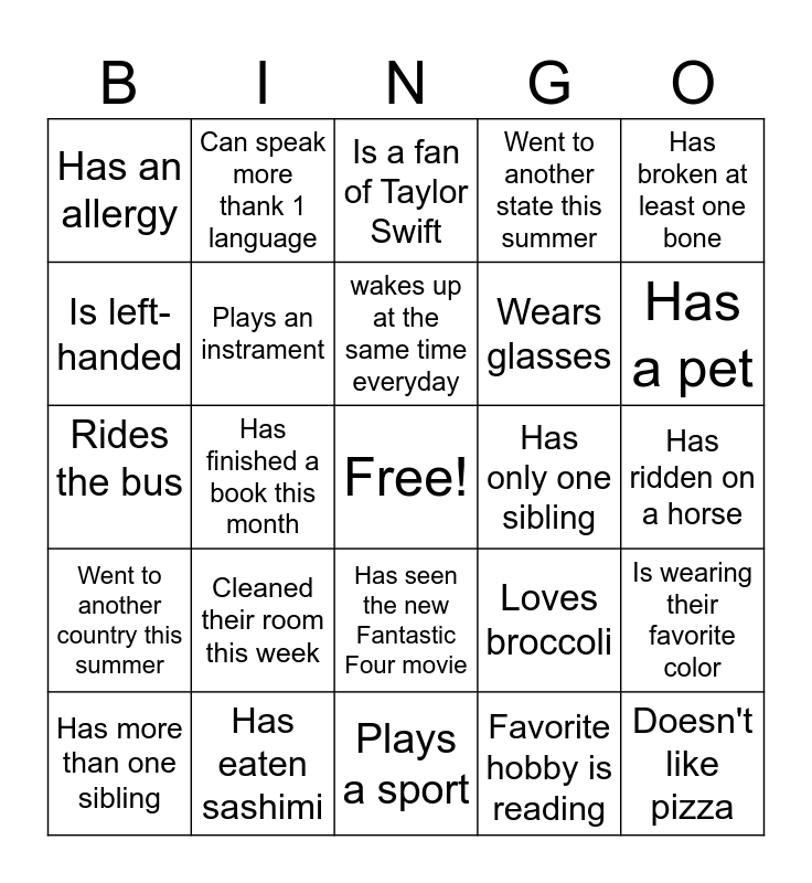 This bingo card has a free space and 24 words: Cleaned their room this week, Has eaten sashimi, wakes up at the same time everyday, Has more than one sibling, Has broken at least one bone, Has an allergy, Is left-handed, Can speak more thank 1 language, Has only one sibling, Has seen the new Fantastic Four movie, Wears glasses, Rides the bus, Loves broccoli, Is wearing their favorite color, Plays an instrament, Favorite hobby is reading, Has ridden on a horse, Is a fan of Taylor Swift, Has a pet, Has finished a book this month, Doesn't like pizza, Went to another country this summer, Went to another state this summer and Plays a sport.