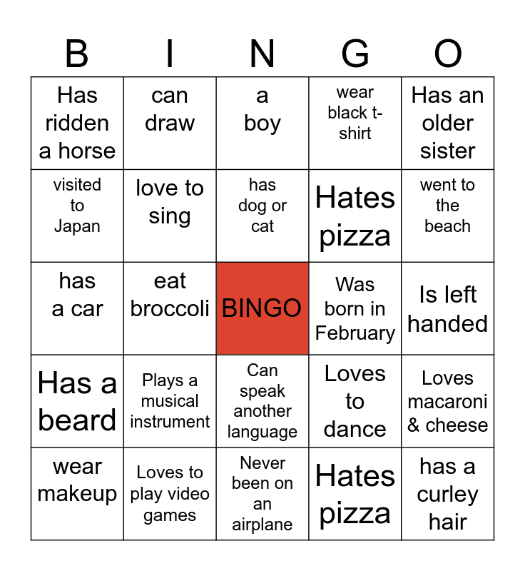 This bingo card has a free space and 74 words: can play basketball, like's Math, a boy, know how to cook, love Kpop, can climb a tree, know's how to play online games, love's English, wear makeup, a girl, likes to dance, love's to swim, has dog or cat, visited to Japan, like's pizza, eat broccoli, wear glasses, went to the beach, wear jacket, has a car, love to sing, can draw, wear black t-shirt, wear a wristwatch, has a curley hair, Rides a motorcycle, Has a younger brother, Is left handed, Does yoga, Was born in June, Has an older sister, Can speak another language, Plays football, Has been to 3 continents, Loves macaroni & cheese, Hates pizza, BINGO, Has a beard, Is an only child, Was born in February, Never been on an airplane, Loves to play video games, Has a pet dog, Loves to dance, Has a pet cat, Has ridden a horse, Has made a YouTube video, Plays a musical instrument, Has written a blog, BINGO, Rides a motorcycle, Has a younger brother, Is left handed, Does yoga, Was born in June, Has an older sister, Can speak another language, Plays football, Has been to 3 continents, Loves macaroni & cheese, Hates pizza, Has curly hair, Has a beard, Is an only child, Was born in February, Never been on an airplane, Loves to play video games, Has a pet dog, Loves to dance, Has a pet cat, Has ridden a horse, Has made a YouTube video, Plays a musical instrument and Has written a blog.