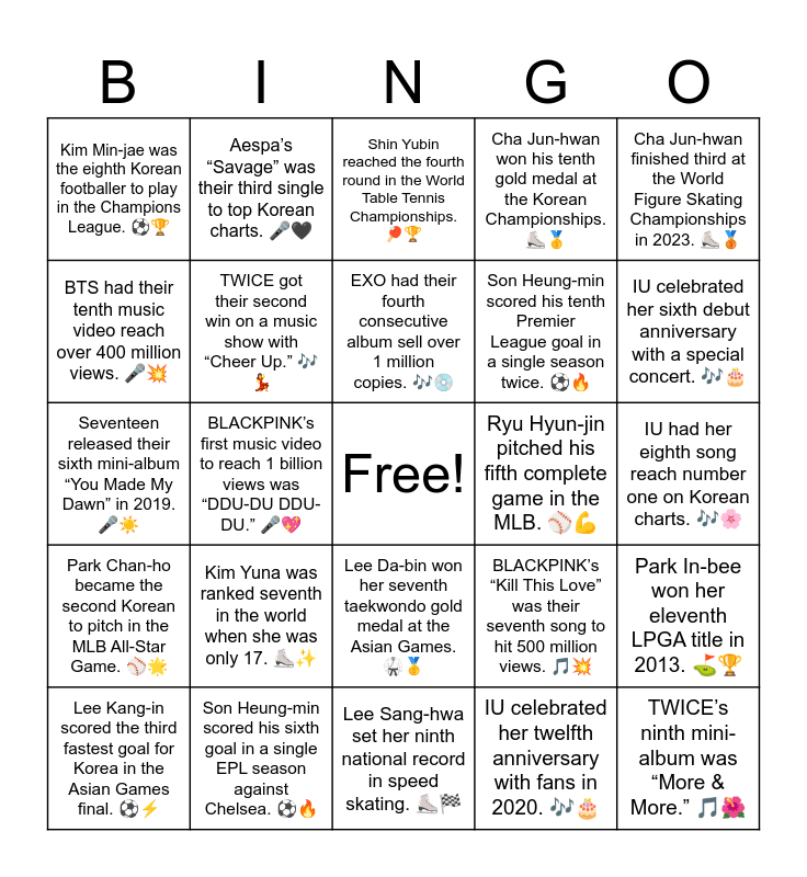 This bingo card has a free space and 33 words: Kim Yuna won her first gold medal in figure skating at the 2010 Olympics. ⛸🥇, Son Heung-min scored his first Premier League goal for Tottenham in 2015. ⚽️🔥, BLACKPINK’s first music video to reach 1 billion views was “DDU-DU DDU-DU.” 🎤💖, BTS ranked second on Billboard’s Global 200 with “Butter.” 🎵🧈, Park Chan-ho became the second Korean to pitch in the MLB All-Star Game. ⚾️🌟, TWICE got their second win on a music show with “Cheer Up.” 🎶💃, Cha Jun-hwan finished third at the World Figure Skating Championships in 2023. ⛸🥉, Lee Kang-in scored the third fastest goal for Korea in the Asian Games final. ⚽️⚡, Aespa’s “Savage” was their third single to top Korean charts. 🎤🖤, Kim Min-jae became the fourth Korean footballer to play in Serie A. ⚽️🇮🇹, EXO had their fourth consecutive album sell over 1 million copies. 🎶💿, Shin Yubin reached the fourth round in the World Table Tennis Championships. 🏓🏆, Han So-hee starred in her fifth drama before turning 30. 🎬🌸, BTS held their fifth concert tour in 2018 called “Love Yourself.” 🎤💜, Ryu Hyun-jin pitched his fifth complete game in the MLB. ⚾️💪, IU celebrated her sixth debut anniversary with a special concert. 🎶🎂, Son Heung-min scored his sixth goal in a single EPL season against Chelsea. ⚽️🔥, Seventeen released their sixth mini-album “You Made My Dawn” in 2019. 🎤☀️, Kim Yuna was ranked seventh in the world when she was only 17. ⛸✨, BLACKPINK’s “Kill This Love” was their seventh song to hit 500 million views. 🎵💥, Lee Da-bin won her seventh taekwondo gold medal at the Asian Games. 🥋🥇, BTS’s eighth album was “BE,” released in 2020. 🎤💜, Kim Min-jae was the eighth Korean footballer to play in the Champions League. ⚽️🏆, IU had her eighth song reach number one on Korean charts. 🎶🌸, Lee Sang-hwa set her ninth national record in speed skating. ⛸🏁, TWICE’s ninth mini-album was “More & More.” 🎵🌺, Cha Jun-hwan won his tenth gold medal at the Korean Championships. ⛸🥇, Son Heung-min scored his tenth Premier League goal in a single season twice. ⚽️🔥, BTS had their tenth music video reach over 400 million views. 🎤💥, Park In-bee won her eleventh LPGA title in 2013. ⛳️🏆, Kim Yeon-koung scored her eleventh point in the Olympic semifinal against Brazil. 🏐🔥, IU celebrated her twelfth anniversary with fans in 2020. 🎶🎂 and Seventeen’s twelfth single was a Japanese release called “Power of Love.” 🎤❤️.