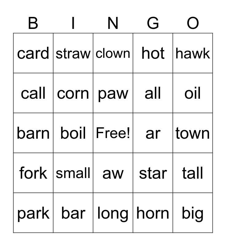 This bingo card has a free space and 24 words: small, bar, paw, park, hawk, card, call, straw, ar, aw, all, barn, star, tall, corn, horn, town, clown, oil, boil, big, fork, hot and long.