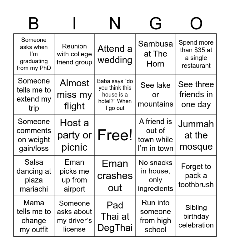 This bingo card has a free space and 24 words: Eman picks me up from airport, Someone asks about my driver’s license, Baba says “do you think this house is a hotel?” When I go out, Mama tells me to change my outfit, Spend more than $35 at a single restaurant, Someone asks when I’m graduating from my PhD, Someone tells me to extend my trip, Reunion with college friend group, A friend is out of town while I’m in town, Eman crashes out, See lake or mountains, Someone comments on weight gain/loss, No snacks in house, only ingredients, Forget to pack a toothbrush, Almost miss my flight, Run into someone from high school, Jummah at the mosque, Attend a wedding, See three friends in one day, Host a party or picnic, Sibling birthday celebration, Salsa dancing at plaza mariachi, Sambusa at The Horn and Pad Thai at DegThai.