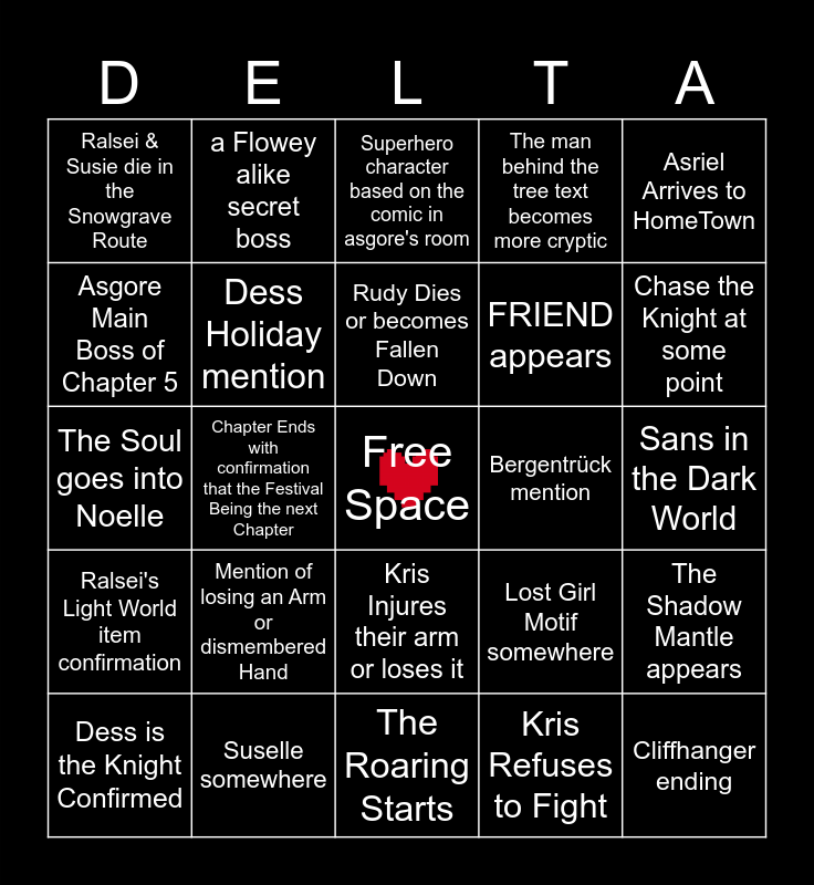 This bingo card has a free space and 24 words: Mention of losing an Arm or dismembered Hand, Suselle somewhere, Rudy Dies or becomes Fallen Down, Dess is the Knight Confirmed, Asriel Arrives to HomeTown, Ralsei & Susie die in the Snowgrave Route, Asgore Main Boss of Chapter 5, a Flowey alike secret boss, Bergentrück mention, Kris Injures their arm or loses it, FRIEND appears, The Soul goes into Noelle, Lost Girl Motif somewhere, The Shadow Mantle appears, Dess Holiday mention, Kris Refuses to Fight, Sans in the Dark World, Superhero character based on the comic in asgore's room, Chase the Knight at some point, Chapter Ends with confirmation that the Festival Being the next Chapter, Cliffhanger ending, Ralsei's Light World item confirmation, The man behind the tree text becomes more cryptic and The Roaring Starts.