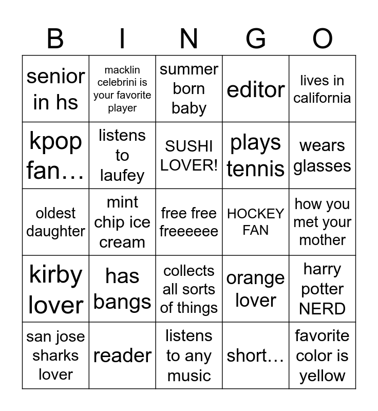 This bingo card has a free space and 24 words: has bangs, reader, SUSHI LOVER!, san jose sharks lover, lives in california, senior in hs, kpop fan…, macklin celebrini is your favorite player, HOCKEY FAN, collects all sorts of things, plays tennis, oldest daughter, orange lover, harry potter NERD, listens to laufey, short…, how you met your mother, summer born baby, wears glasses, mint chip ice cream, favorite color is yellow, kirby lover, editor and listens to any music.