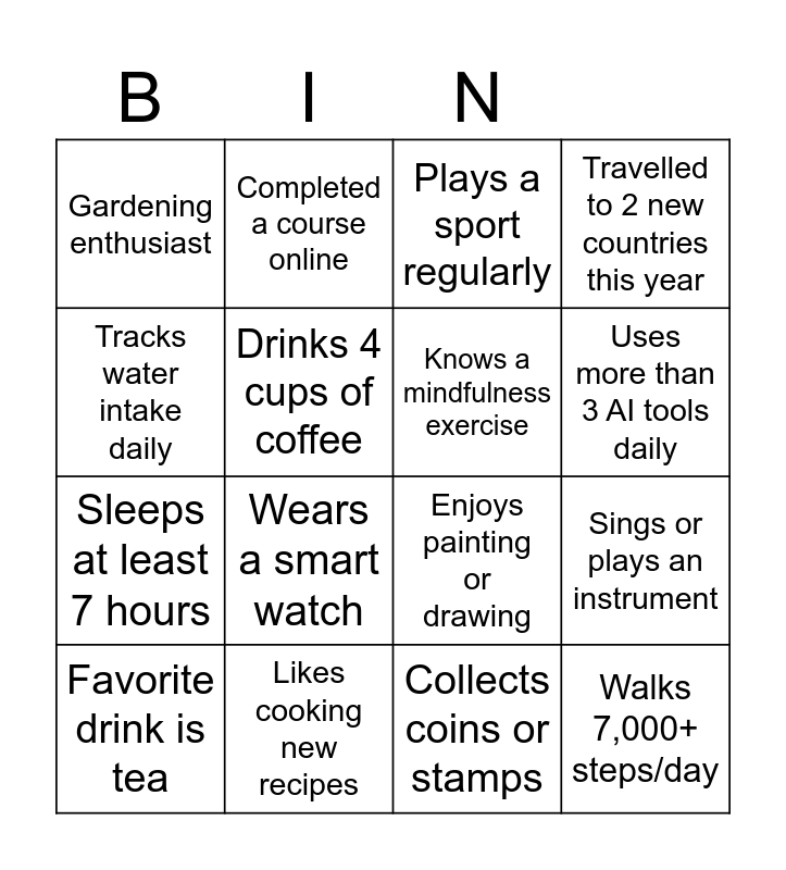 This bingo card has 16 words: Likes cooking new recipes, Sings or plays an instrument, Plays a sport regularly, Gardening enthusiast, Sleeps at least 7 hours, Completed a course online, Enjoys painting or drawing, Collects coins or stamps, Tracks water intake daily, Drinks 4 cups of coffee, Favorite drink is tea, Travelled to 2 new countries this year, Wears a smart watch, Uses more than 3 AI tools daily, Knows a mindfulness exercise and Walks 7,000+ steps/day.