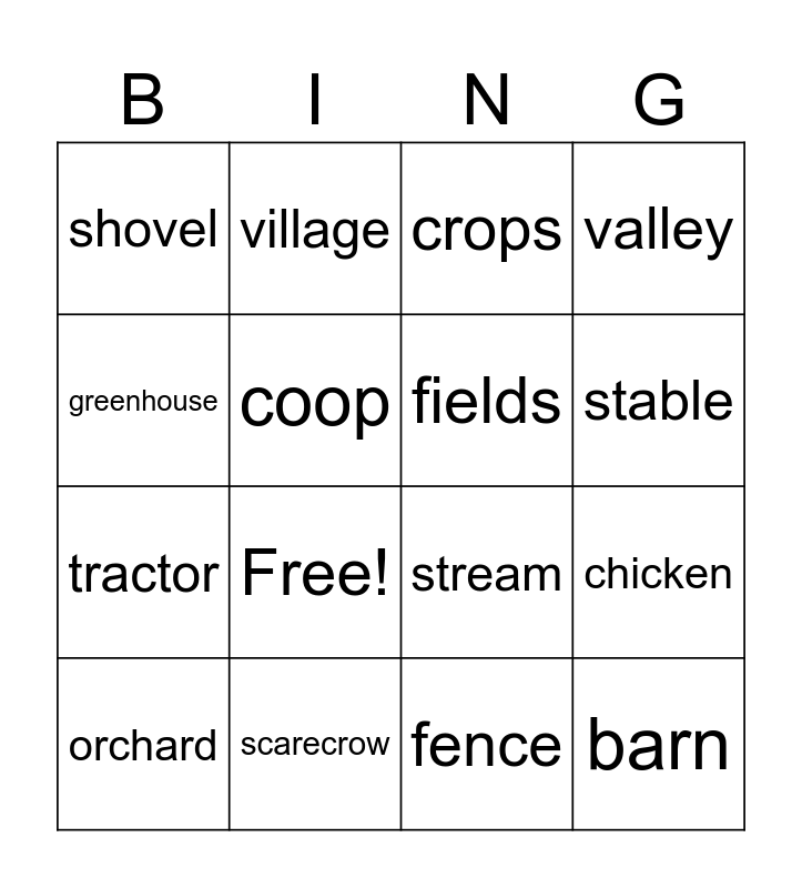 This bingo card has 18 words: Free!, barn, crops, shovel, stream, valley, orchard, village, stable, tractor, fence, greenhouse, chicken, coop, fields, hoe, scarecrow and well.