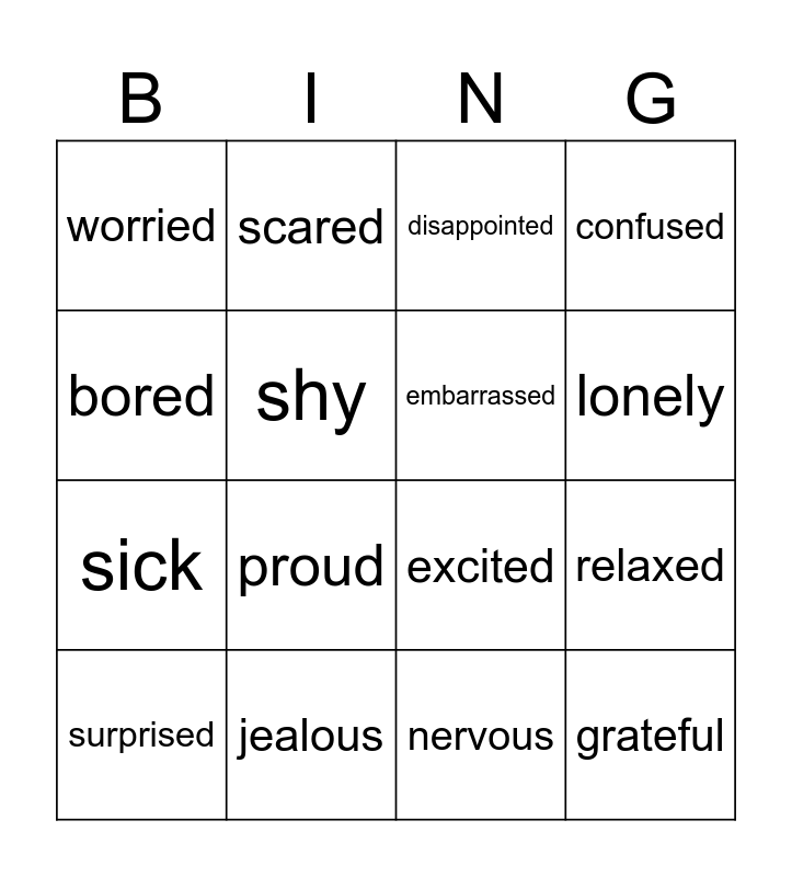 This bingo card has 16 words: jealous, relaxed, disappointed, worried, sick, scared, excited, nervous, bored, shy, surprised, confused, proud, lonely, embarrassed and grateful.