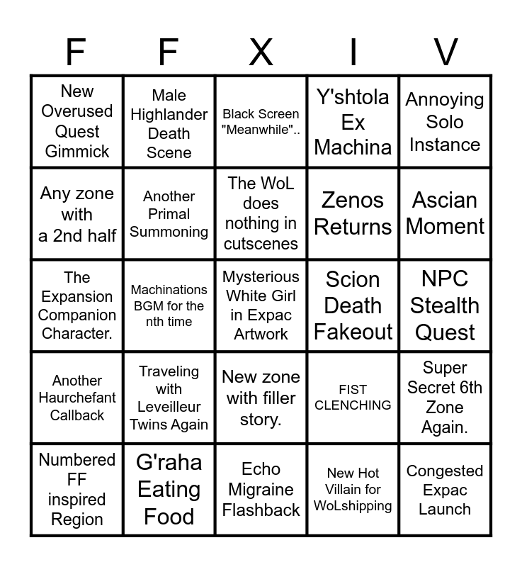 This bingo card has 25 words: Traveling with Leveilleur Twins Again, Echo Migraine Flashback, The WoL does nothing in cutscenes, Numbered FF inspired Region, Annoying Solo Instance, New Overused Quest Gimmick, Any zone with a 2nd half, Male Highlander Death Scene, Scion Death Fakeout, New zone with filler story., Zenos Returns, The Expansion Companion Character., FIST CLENCHING, Super Secret 6th Zone Again., Another Primal Summoning, Congested Expac Launch, NPC Stealth Quest, Black Screen "Meanwhile".., Ascian Moment, Machinations BGM for the nth time, Mysterious White Girl in Expac Artwork, G'raha Eating Food, Another Haurchefant Callback, Y'shtola Ex Machina and New Hot Villain for WoLshipping.