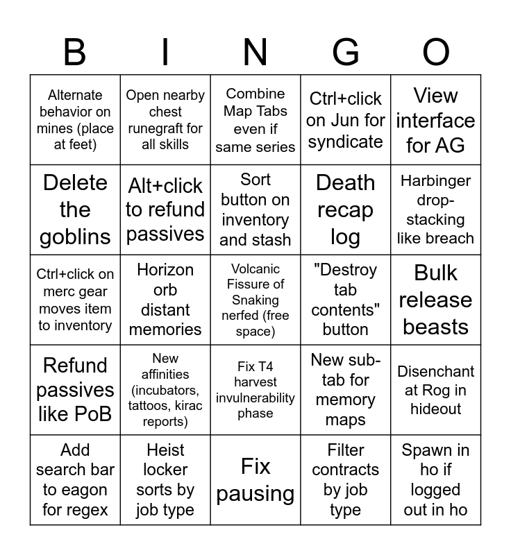 This bingo card has a free space and 31 words: Fix pausing, Character selection sorting, Horizon orb distant memories, Filtering uniques, Alternate behavior on mines (place at feet), Combine Map Tabs even if same series, Alt+click to refund passives, New sub-tab for memory maps, "Destroy tab contents" button, Filter contracts by job type, Bulk release beasts, Spawn in ho if logged out in ho, "Transfer inventory to stash" button, Offering to the goddess from stash, Harbinger drop-stacking like breach, Change essences to 1 click, Disenchant at Rog in hideout, New affinities (incubators, tattoos, kirac reports), Refund passives like PoB, Fix T4 harvest invulnerability phase, View interface for AG, Add beasts to currency exchange, Add search bar to eagon for regex, Open nearby chest runegraft for all skills, Death recap log, Delete the goblins, Ctrl+click on Jun for syndicate, Ctrl+click on merc gear moves item to inventory, Heist locker sorts by job type, Sort button on inventory and stash and Inspect button on players for their build and mtx.