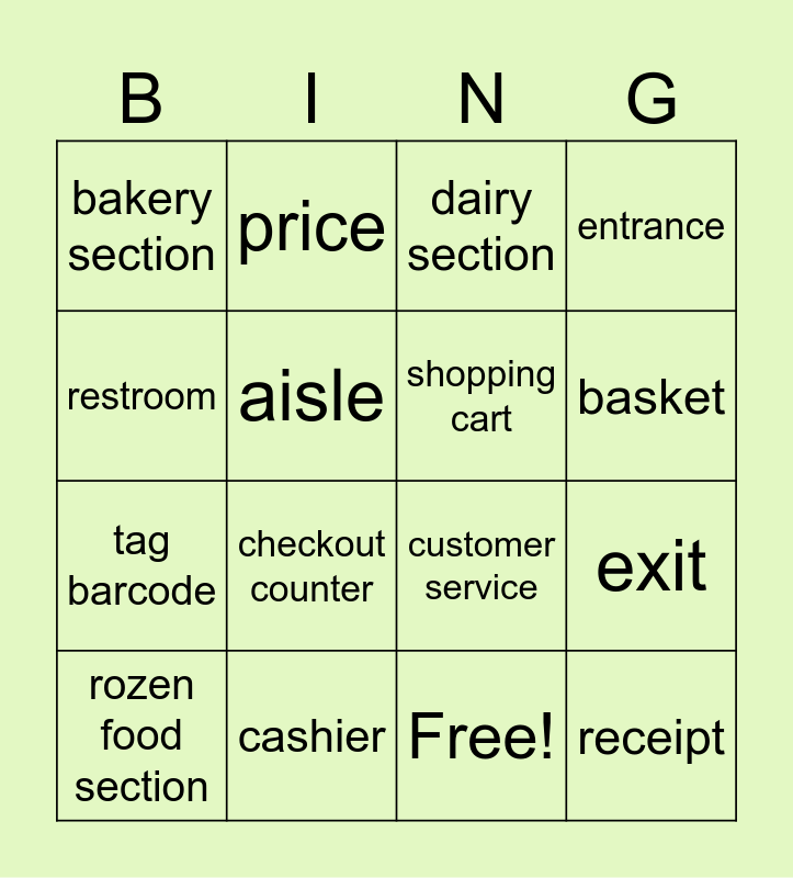 This bingo card has 17 words: Free!, rozen food section, dairy section, bakery section, checkout counter, entrance, exit, shopping cart, basket, aisle, cashier, customer service, restroom, price, tag barcode, shopping list and receipt.