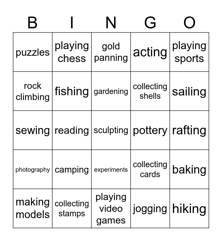 This bingo card has 32 words: jogging, painting, reading, collecting coins, photography, fishing, playing sports, baking, playing chess, hiking, gardening, gold panning, playing instruments, calligraphy, pottery, golf, making models, sewing, experiments, camping, collecting cards, knitting, rafting, collecting stamps, sculpting, acting, collecting shells, rock climbing, puzzles, playing video games, cycling and sailing.