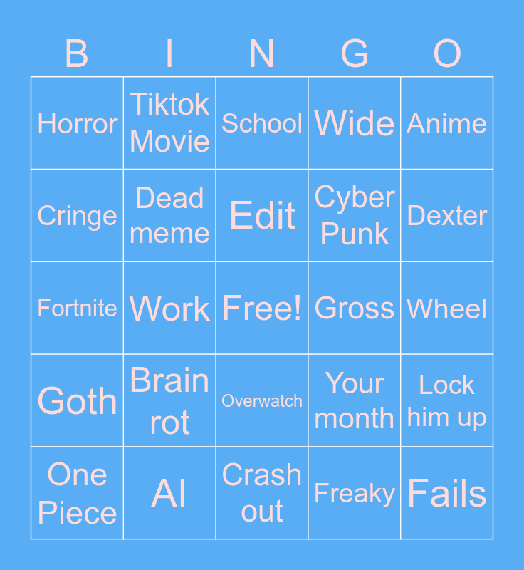 This bingo card has a free space and 24 words: Brain rot, AI, Edit, One Piece, Anime, Horror, Cringe, Tiktok Movie, Gross, Overwatch, Cyber Punk, Fortnite, Your month, Lock him up, Dead meme, Freaky, Wheel, School, Dexter, Work, Fails, Goth, Wide and Crash out.