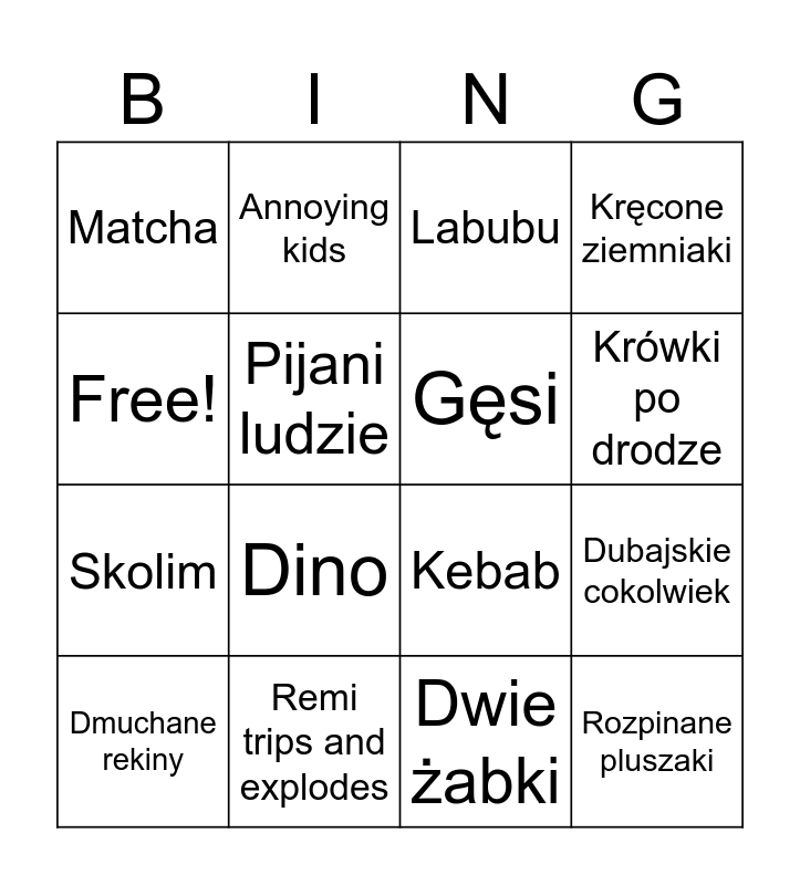 This bingo card has 16 words: Remi trips and explodes, Dubajskie cokolwiek, Labubu, Matcha, Skolim, Annoying kids, Kebab, Dwie żabki, Free!, Pijani ludzie, Dmuchane rekiny, Kręcone ziemniaki, Dino, Krówki po drodze, Gęsi and Rozpinane pluszaki.