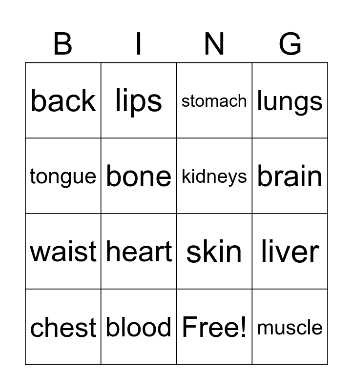 This bingo card has 17 words: Free!, chest, stomach, back, heart, lungs, liver, kidneys, brain, bone, blood, skin, tongue, lips, waist, throat and muscle.