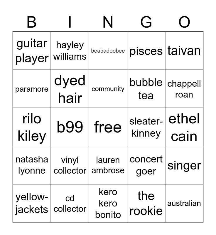 This bingo card has a free space and 24 words: vinyl collector, cd collector, community, yellow-jackets, taivan, guitar player, paramore, hayley williams, sleater-kinney, lauren ambrose, bubble tea, rilo kiley, concert goer, singer, dyed hair, the rookie, ethel cain, beabadoobee, chappell roan, b99, australian, natasha lyonne, pisces and kero kero bonito.