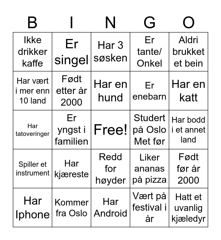 This bingo card has a free space and 24 words: Har kjæreste, Kommer fra Oslo, Har en hund, Har Iphone, Aldri brukket et bein, Ikke drikker kaffe, Har vært i mer enn 10 land, Er singel, Studert på Oslo Met før, Redd for høyder, Er enebarn, Har tatoveringer, Liker ananas på pizza, Født før år 2000, Født etter år 2000, Vært på festival i år, Har bodd i et annet land, Har 3 søsken, Har en katt, Er yngst i familien, Hatt et uvanlig kjæledyr, Spiller et instrument, Er tante/ Onkel and Har Android.