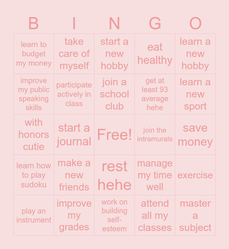 This bingo card has a free space and 24 words: make a new friends, improve my grades, join a school club, play an instrument, learn a new hobby, learn to budget my money, improve my public speaking skills, take care of myself, join the intramurals, rest hehe, get at least 93 average hehe, with honors cutie, manage my time well, exercise, participate actively in class, attend all my classes, save money, start a new hobby, learn a new sport, start a journal, master a subject, learn how to play sudoku, eat healthy and work on building self-esteem.