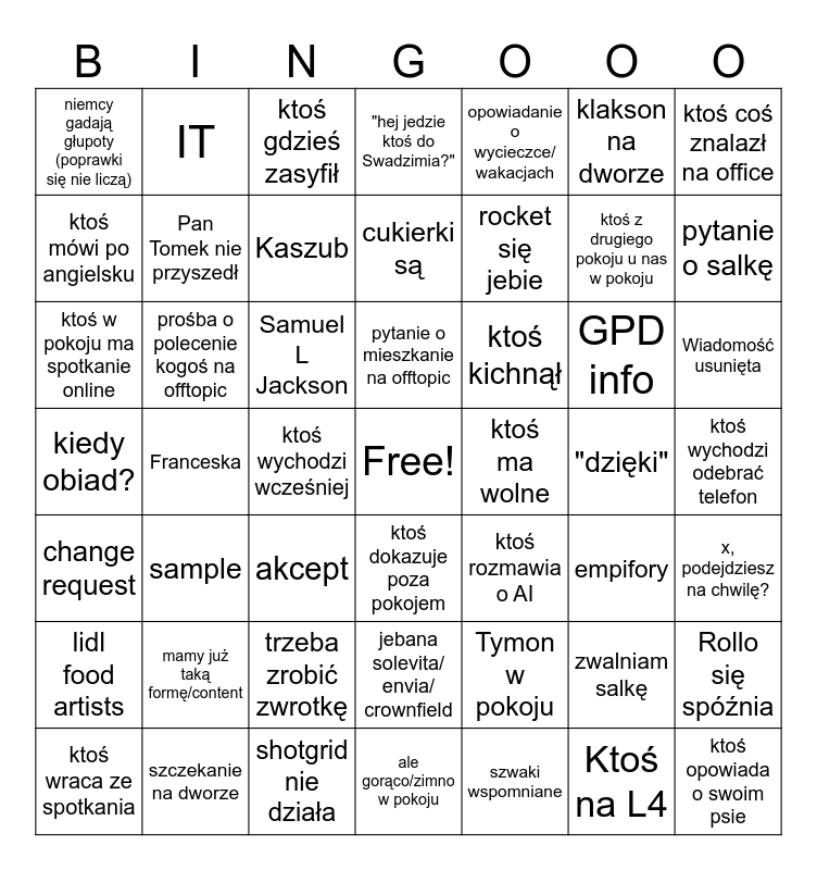 This bingo card has a free space and 48 words: Tymon w pokoju, ktoś z drugiego pokoju u nas w pokoju, ale gorąco/zimno w pokoju, Franceska, Samuel L Jackson, ktoś wychodzi odebrać telefon, IT, szczekanie na dworze, klakson na dworze, ktoś dokazuje poza pokojem, ktoś coś znalazł na office, "hej jedzie ktoś do Swadzimia?", GPD info, ktoś kichnął, lidl food artists, "dzięki", ktoś mówi po angielsku, pytanie o salkę, zwalniam salkę, opowiadanie o wycieczce/ wakacjach, rocket się jebie, ktoś wychodzi wcześniej, niemcy gadają głupoty (poprawki się nie liczą), Pan Tomek nie przyszedł, Rollo się spóźnia, Kaszub, Wiadomość usunięta, ktoś wraca ze spotkania, pytanie o mieszkanie na offtopic, prośba o polecenie kogoś na offtopic, Ktoś na L4, ktoś ma wolne, x, podejdziesz na chwilę?, mamy już taką formę/content, kiedy obiad?, ktoś rozmawia o AI, empifory, ktoś w pokoju ma spotkanie online, akcept, trzeba zrobić zwrotkę, change request, ktoś opowiada o swoim psie, ktoś gdzieś zasyfił, shotgrid nie działa, cukierki są, jebana solevita/ envia/ crownfield, sample and szwaki wspomniane.