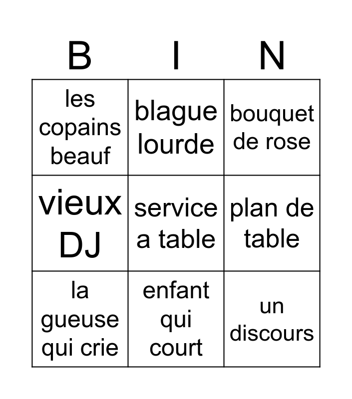 This bingo card has a free space and 8 words: plan de table, bouquet de rose, blague lourde, la gueuse qui crie, les copains beauf, un discours, vieux DJ and enfant qui court.