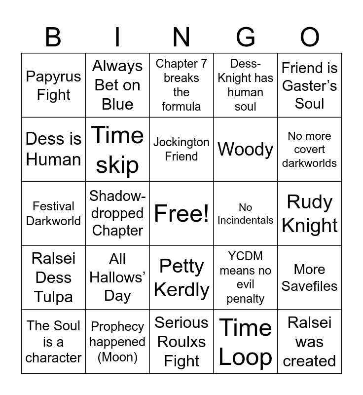 This bingo card has a free space and 24 words: All Hallows’ Day, Prophecy happened (Moon), Jockington Friend, The Soul is a character, Friend is Gaster’s Soul, Papyrus Fight, Dess is Human, Always Bet on Blue, No Incindentals, Petty Kerdly, Woody, Festival Darkworld, YCDM means no evil penalty, More Savefiles, Time skip, Time Loop, Rudy Knight, Chapter 7 breaks the formula, No more covert darkworlds, Shadow-dropped Chapter, Ralsei was created, Ralsei Dess Tulpa, Dess-Knight has human soul and Serious Roulxs Fight.