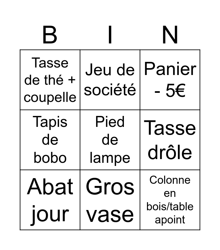 This bingo card has a free space and 8 words: Tasse drôle, Panier - 5€, Jeu de société, Abat jour, Tasse de thé + coupelle, Colonne en bois/table apoint, Tapis de bobo and Gros vase.