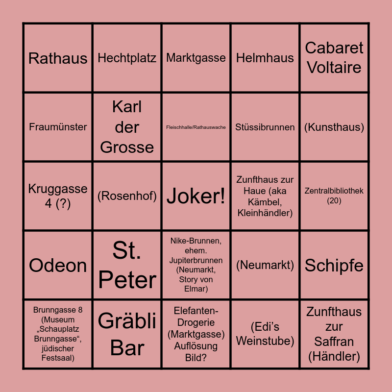 This bingo card has a free space and 80 words: Rindermarkt, Neumarkt, Marktgasse, Limmatquai, Hirschengraben, Zähringerstrasse, Trittligasse, Münstergasse, Niederdorfstrasse, Kirchgasse (10), Brunngasse, Augustinergasse, Helmhaus, Rathaus, StadthausGrossmünster, Fraumünster, Predigerkirche, St. Peter, Wasserkirche (verbunden mit Helmhaus), Zentralbibliothek (20), Theater Neumarkt, Cabaret Voltaire, Kruggasse 4 (?), Fleischhalle/Rathauswache, Karl der Grosse, Hotel Storchen (Zunft zur Schiffleuten), Widder Hotel (Zunft zum Widder, Metzger und Viehhändler), Restaurant Weisser Wind (Zunft zum Weggen, Bäcker und Müller), Kulturhaus Helferei, Altstadthaus (GZ) (30), (Kunsthaus), Grobs Geburtshaus, Züri Bar (?), Elefanten-Drogerie (Marktgasse) Auflösung Bild?, Bianchi (Ex, Marktgasse), Brunngasse 8 (Museum „Schauplatz Brunngasse“, jüdischer Festsaal), Zunfthaus zur Haue (aka Kämbel, Kleinhändler), Zunfthaus zur Zimmerleuten (Zimmerleute, Maurer, Wagner etc.), Zunfthaus zur Waag (u. a. Weber), Zunfthaus zur Meisen (Weinhändler, Gastwirte, Sattler und Maler), Zunfthaus zur Saffran (Händler), Haus zum Rüden (Ritter und Edelleute), Predigerplatz, Zähringerplatz, Hirschenplatz, Kartoffelmarkt, Hechtplatz, Zwingliplatz, Lindenhof, Münsterhof (Auflösung?), Rennweg, Schipfe, (Rosenhof), (Neumarkt), (Weinplatz), (Trittliwiese), (Spielplatz Untere Zäune), Susanne-Gossweiler-Platz (Zwischenhalt mit Anna L.), Napfbrunnen (Napfgasse, eigentlich Platz), Pelikanbrunnen (Leuengasse), Nike-Brunnen, ehem. Jupiterbrunnen (Neumarkt, Story von Elmar), Stüssibrunnen, Auf Predigerplatz?, David-Brunnen, Münsterhof-Brunnen (modern), Ramos Lebensmittel, Zähringer, Dr bluetig Duume / Rheinfelder Bierhaus, Rheinfelder Bierhalle, Spanier (?), Dr Schluuch (Ex), Odeon, Gräbli Bar, Restaurant Oepfelchammer, Zunfthäuser!, (D Bar), (Restaurant Kantorei), (Edi’s Weinstube), Rathausbrücke aka Gmüesbrugg, Rudolf-Brun-Brücke and Münsterbrücke.