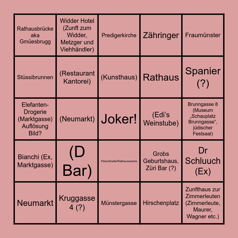 ⚠ This card has duplicate items: (D Bar) (2), (Restaurant Kantorei) (2), (Edi’s Weinstube) (2), Rathausbrücke aka Gmüesbrugg (2), Rudolf-Brun-Brücke (2), Münsterbrücke (2), Kruggasse 4 (?) (2), Fleischhalle/Rathauswache (2), Karl der Grosse (2), Hotel Storchen (Zunft zur Schiffleuten) (2), Widder Hotel (Zunft zum Widder, Metzger und Viehhändler) (2), Restaurant Weisser Wind (Zunft zum Weggen, Bäcker und Müller) (2), Kulturhaus Helferei (2)