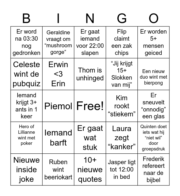 This bingo card has a free space and 24 words: Iemand barft, Ruben wint beeriokart, Thom is unhinged, Nieuwe inside joke, Er worden 5+ mensen geiced, Er word na 03:30 nog gedronken, Celeste wint de pubquiz, Geraldine vraagt om “mushroom gorge”, Kim rookt “stiekem”, Er gaat wat stuk, “Jij krijgt 15+ Slokken van mij”, Iemand krijgt 3+ ants in 1 keer, Laura zegt “kanker”, Quinten doet iets wat hij “niet wil” door groepsdruk, Erwin <3 Erin, Jasper ligt tot 12:00 in bed, Er sneuvelt “onnodig” een glas, Er gaat iemand voor 22:00 slapen, Een nieuw duo wint met bierpong, Piemol, Frederik refereert naar de bijbel, Hero of Lillianne wint met poker, Flip claimt een zak chips and 10+ nieuwe quotes.